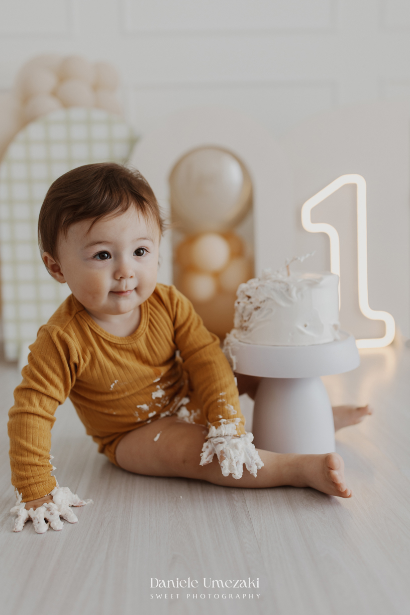 O bolo delicioso foi feito pela @umedoces e a papelaria linda pela Fabi, compondo um cenário neutro, suave e atemporal, perfeito para deixar o Caio brilhar. E ele brilhou: explorou, brincou, deu risada, se lambuzou com o bolo… exatamente como um Smash the Cake deve ser.