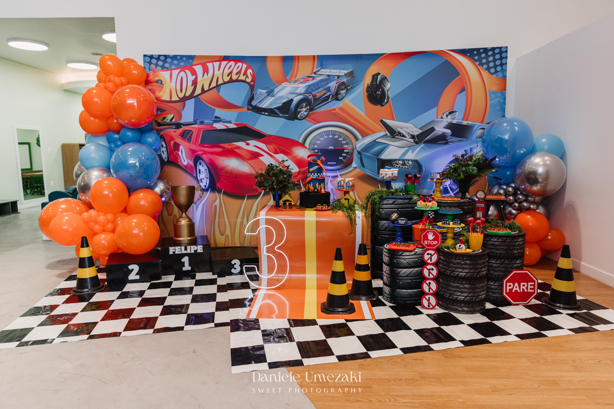 Festa de aniversário infantil em Mogi das Cruzes – Felipe 3 anos no Pé de Caqui com tema Hot Wheels e decoração da Doce de Laço.