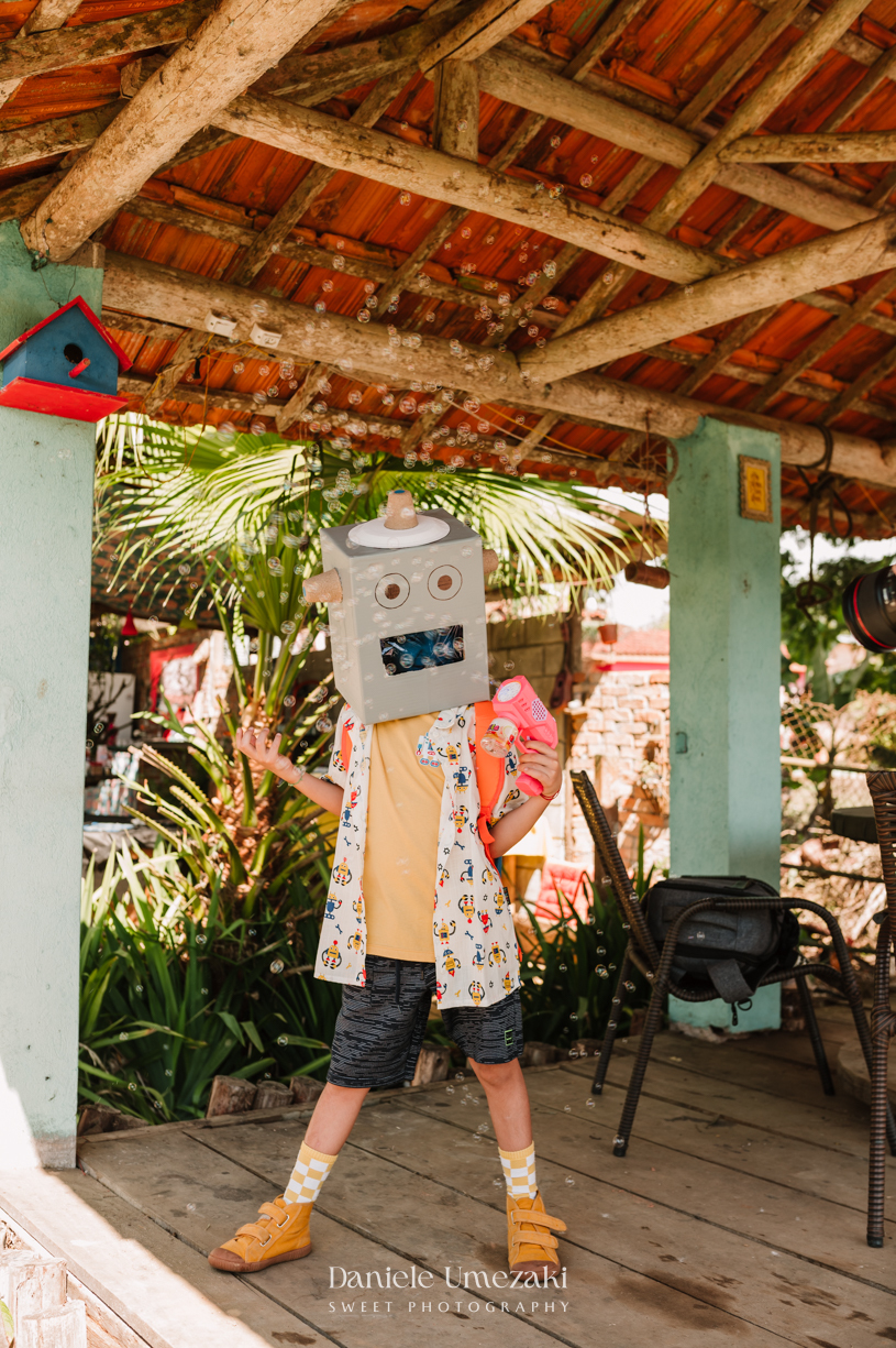 Aniversário de 8 anos do Théo com tema Robôs, em uma festa ao ar livre cheia de criatividade, brincadeiras e momentos especiais. Fotografia infantil afetiva em Mogi das Cruzes por Dani Umezaki.