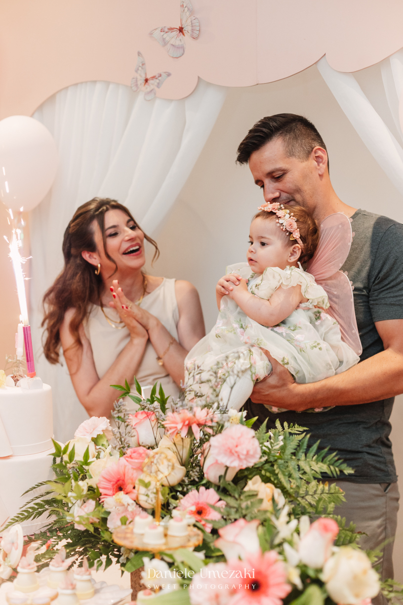 Fotografia de aniversário infantil em Mogi das Cruzes do 1 aninho da Eloise, festa leve e cheia de amor em família, registrada por Dani Umezaki com decoração delicada da Cerejeira Decora.